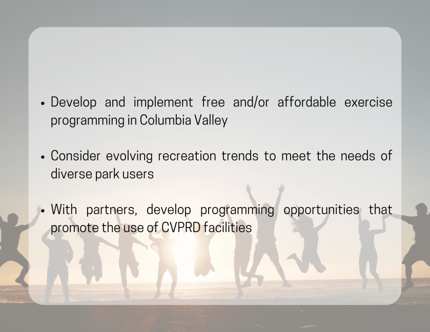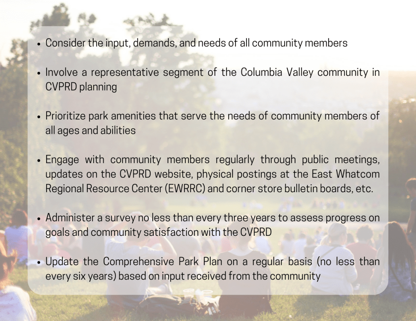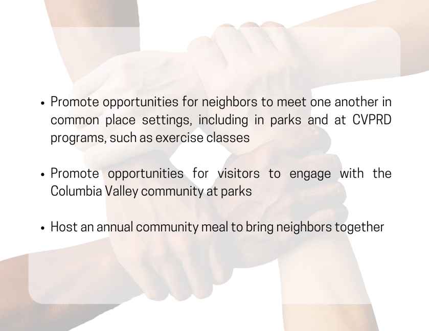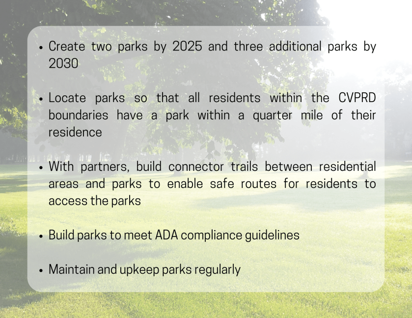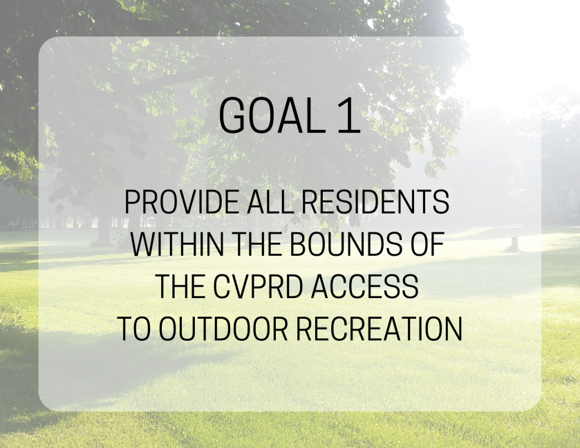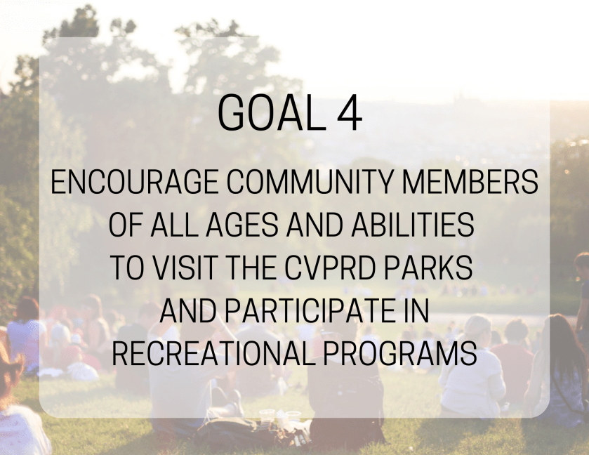 Goals are so important to clearly define and works towards because they are tangible achievements. In 6 years when CVPRD gathers with the community to draft the next version of the comprehensive park plan, it will be so beautiful to see what has been accomplished. Alternatively, it’s also helpful to reflect on what areas still need more focus and attention. Working towards shared community goals inadvertently impacts Goal 3 – Strengthen Community Connections. Together, we can create and work toward a shared community park vision.