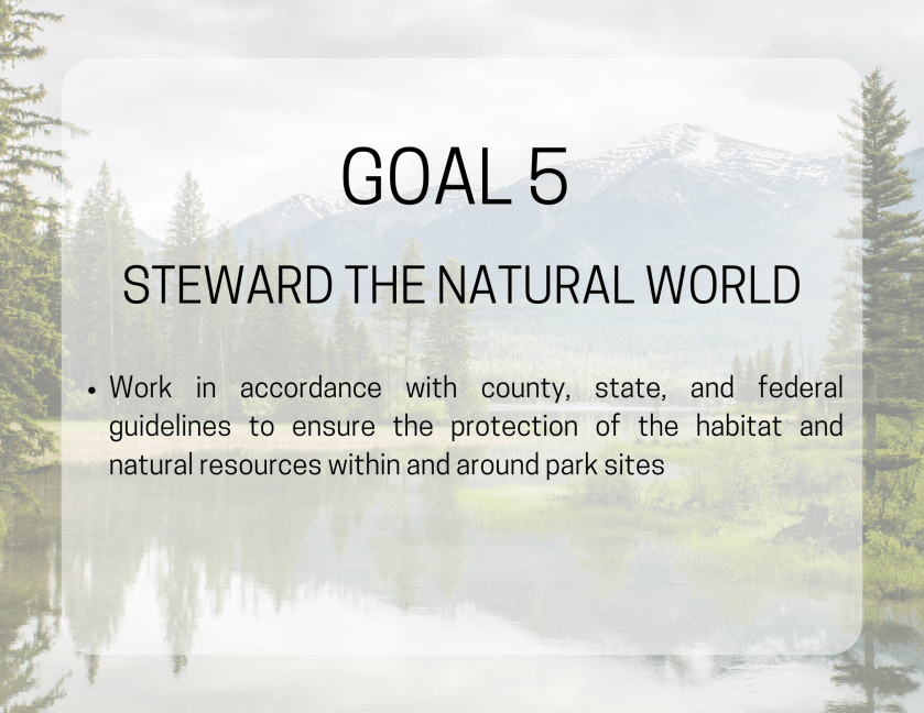 Below we have included a slideshow with the 5 main goals, and the subsequent actions to be taken to achieve those goals. These goals are located in the beginning of the comprehensive park plan and are intended to serve as a guide for future planning actions.