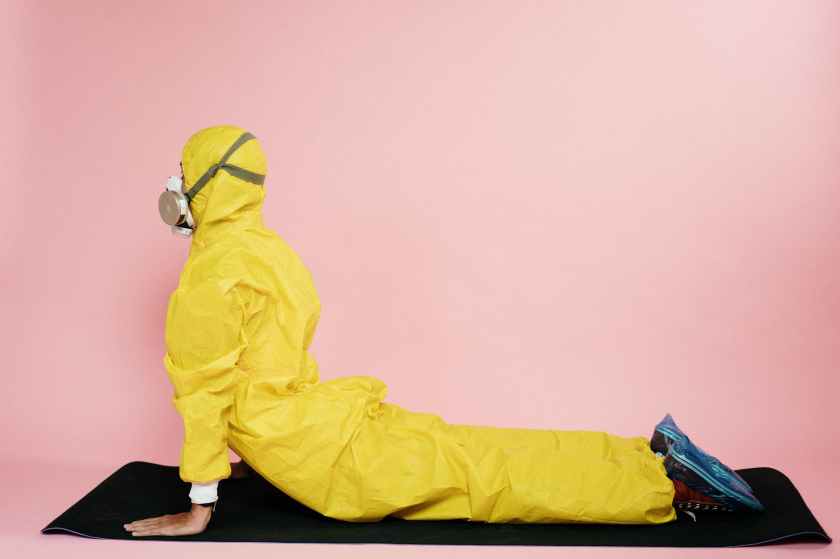 man in yellow protective suit stretching